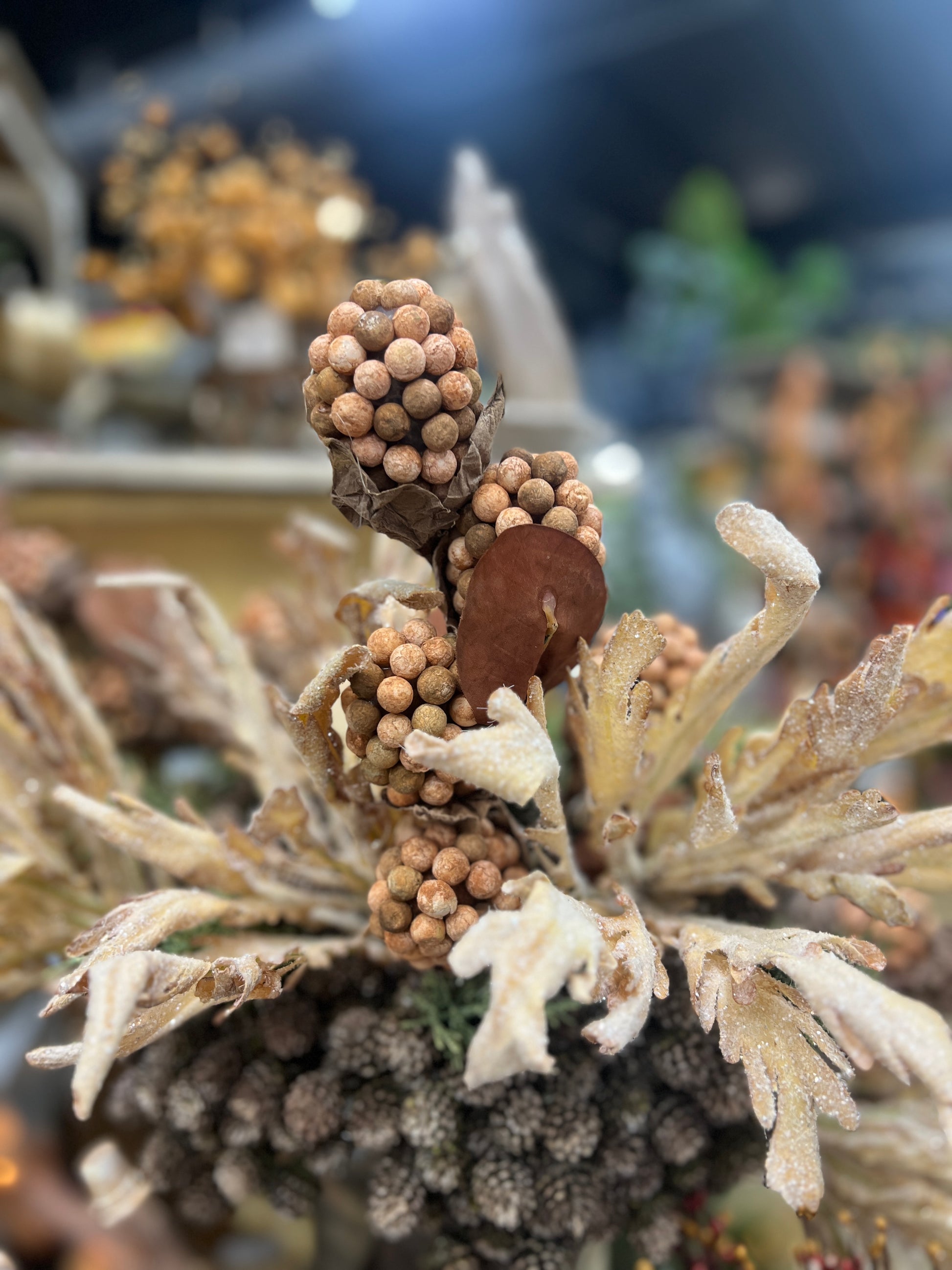 This 18" autumn pod berry spray is a beautiful seasonal accent, featuring rich fall colors with natural-looking pods and berries. Perfect for adding texture and warmth to arrangements, wreaths, centerpieces, or vases, it captures the essence of autumn and enhances any harvest décor.