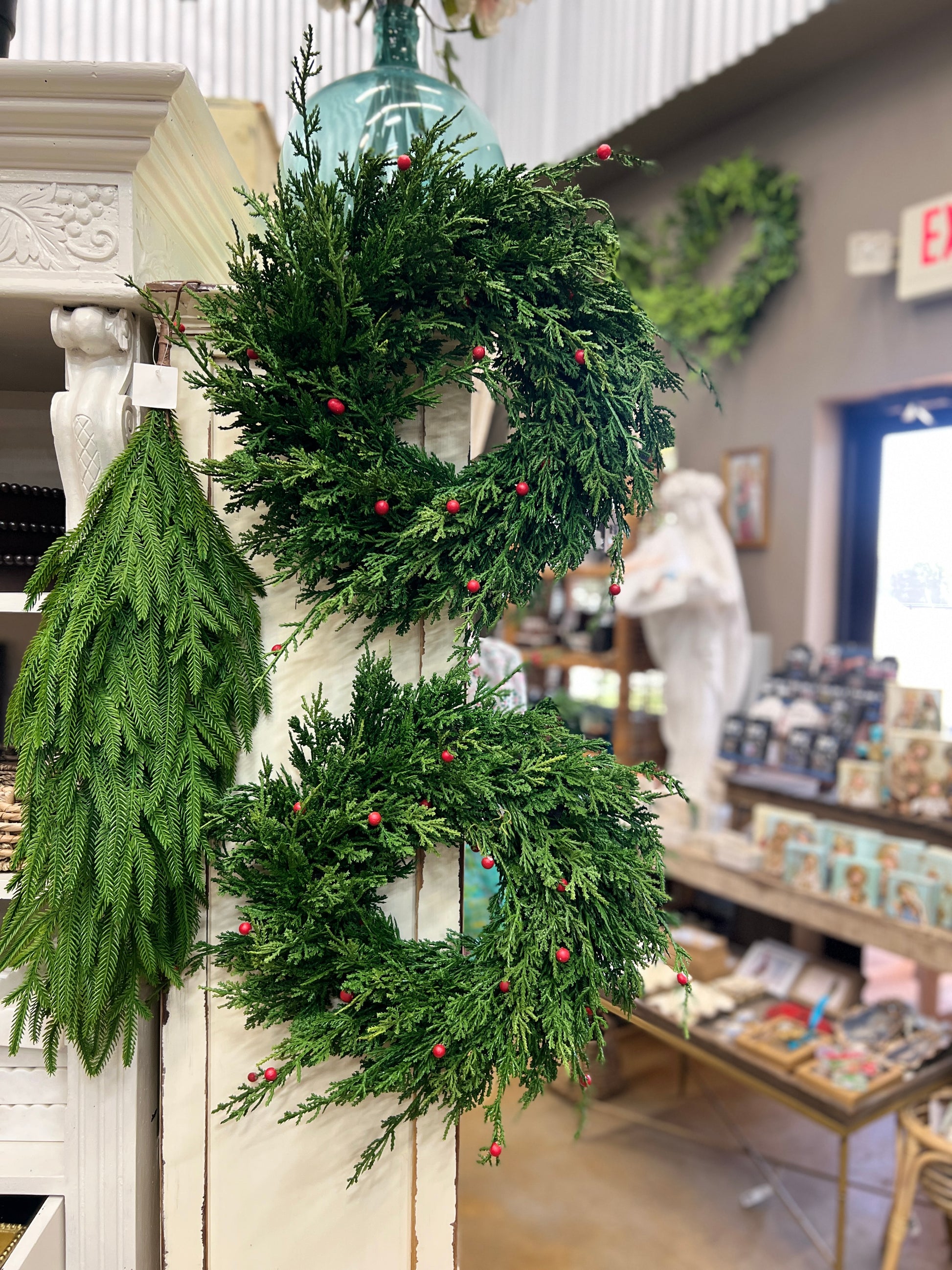 Add festive charm anywhere with this 16" Berry and Cedar Wreath in classic green and red.