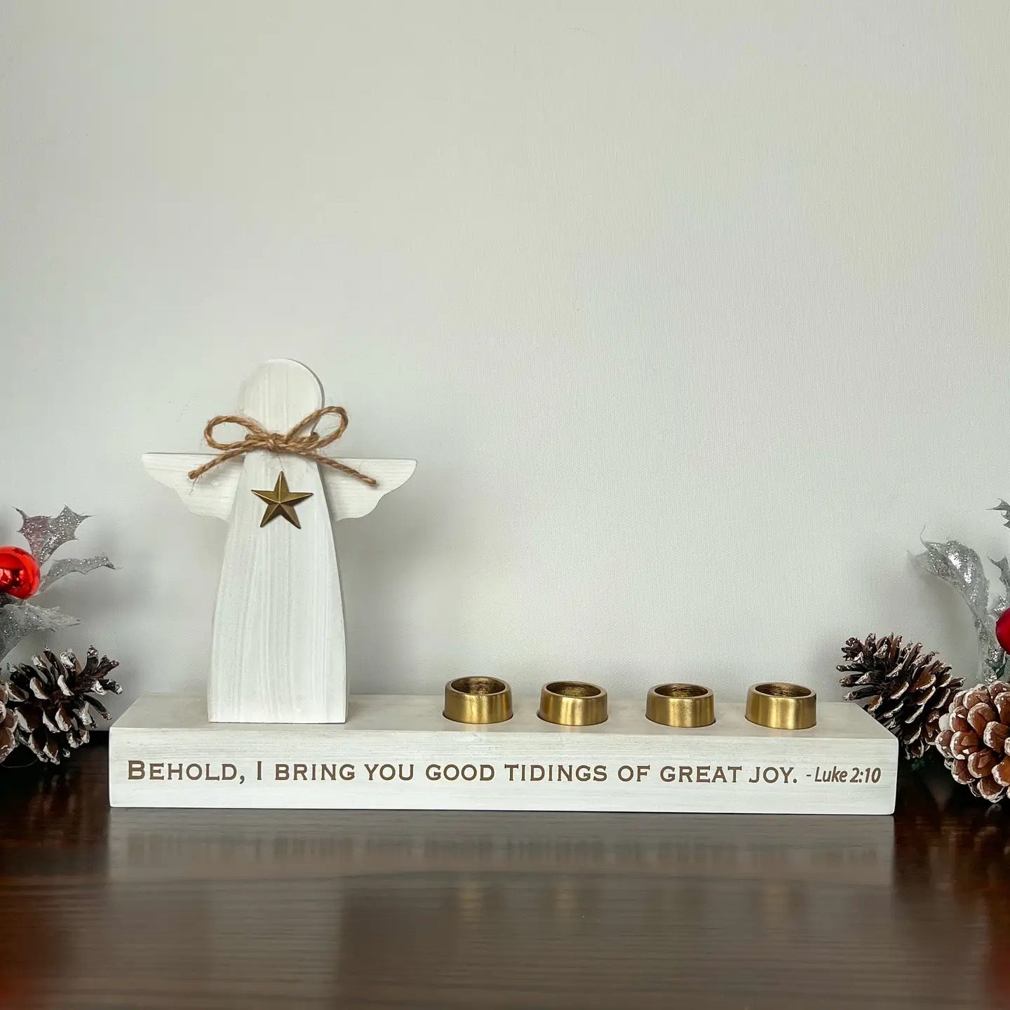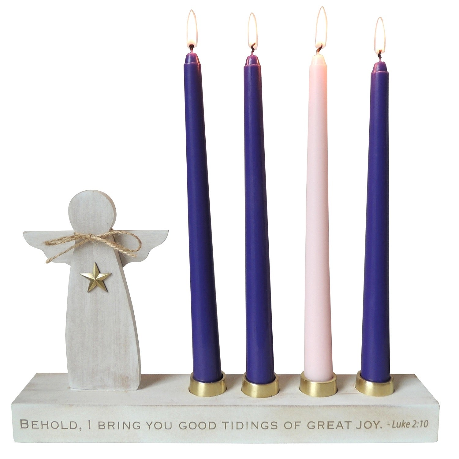 Countdown to Christmas with this sweet angel Advent candle holder. It comes with four bright taper candles (three purple and one pink) and features fun brass star holders.