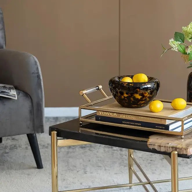The Chee Animal Print Glass Vase features a handcrafted cheetah-inspired pattern in amber and dark brown tones. Its subtle colors add bold impact, perfect for enhancing any terrain-themed space. Make a statement with this unique vase.