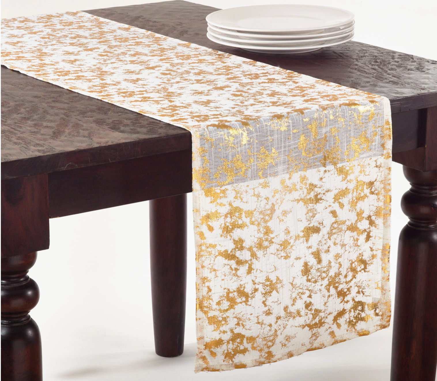 Turn any tablescape into something grand with this metallic print table runner. Boasting a gold foil print design all over, the table runner adds glitzy glam to any setting.