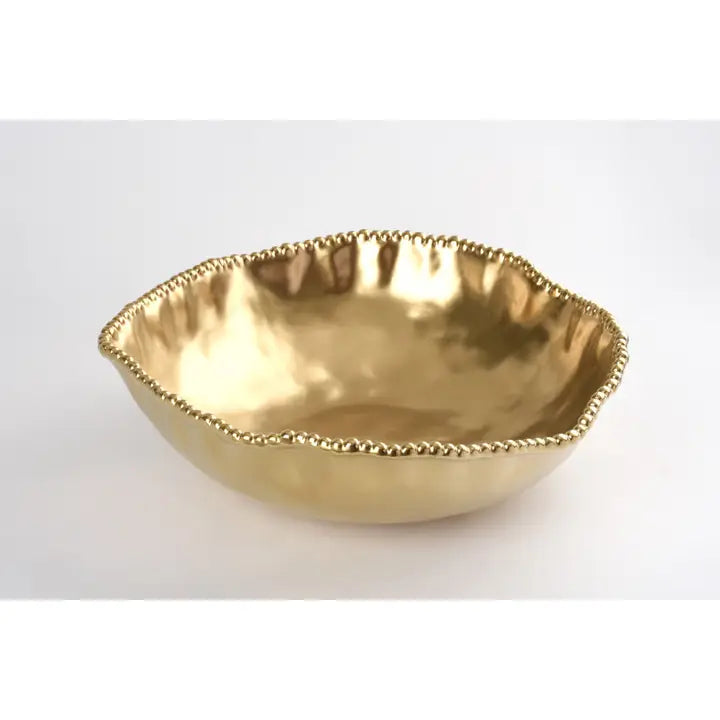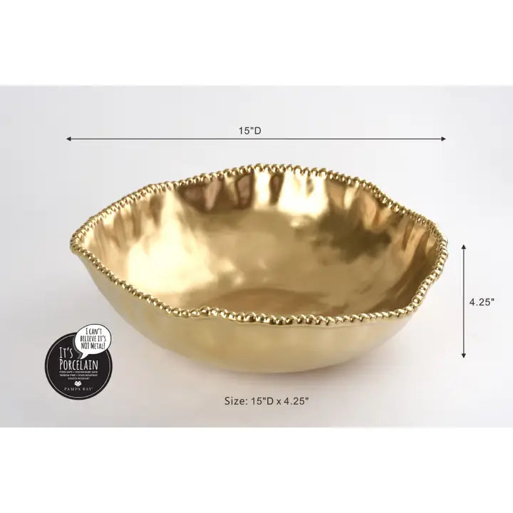 Oversized Serving Bowl from our Monte Carlo Collection. Perfect for your next dinner party or holiday! Roasted potatoes and veggies, spaghetti and meatballs or a simple salad serve up nicely in this beautifully crafted bowl. Crafted in a luxurious matte gold-toned high-fired porcelain with gold beads. Food safe. Dishwasher safe. Oven safe. Easy Care.