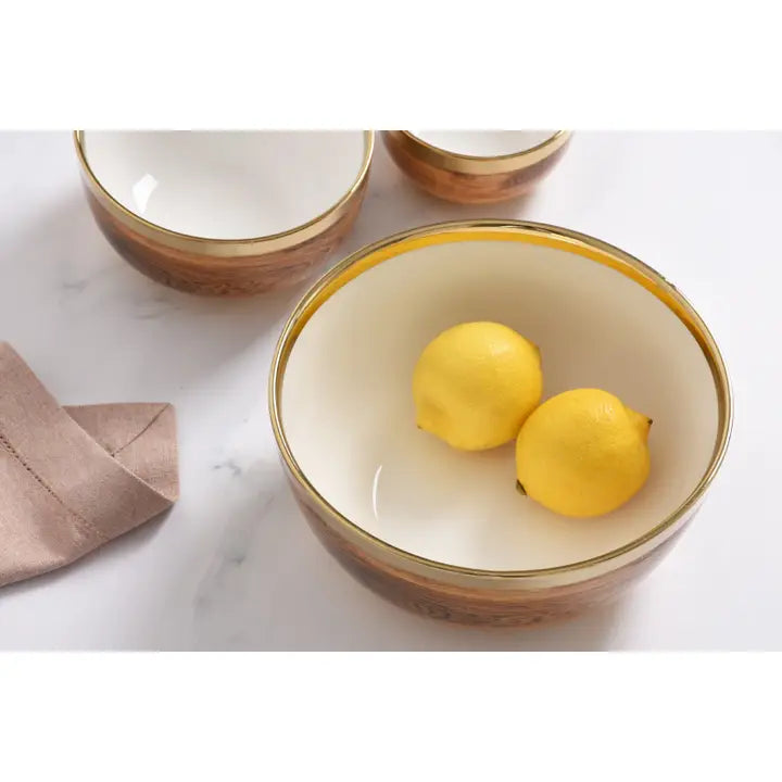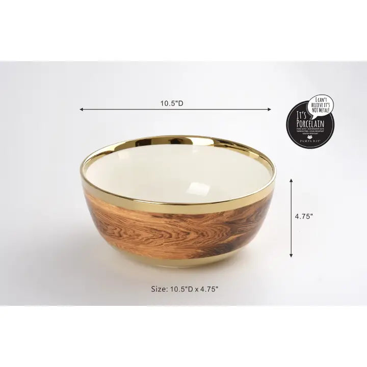 Large Bowl from our Madera Collection. Generously sized bowl for serving salads or side dishes like mashed potatoes, roasted vegetables, or rice! Stunning high-fired porcelain with a rustic wood design and gold-toned rim. Food safe, dishwasher safe, oven safe. Tarnish and stain-free. Easy Care.