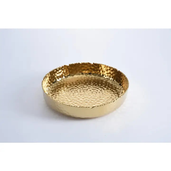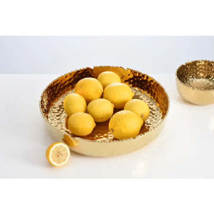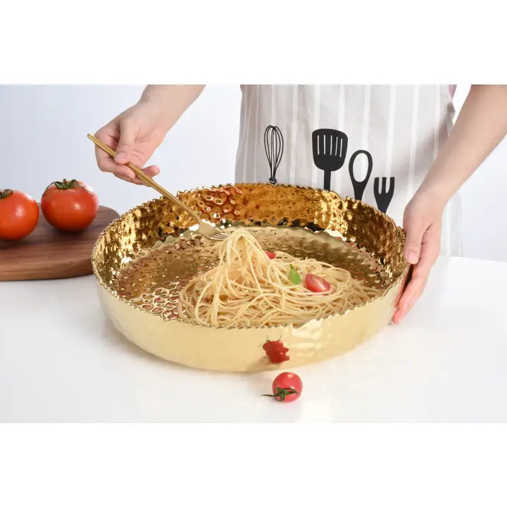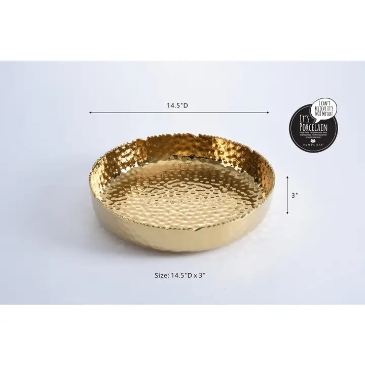 Extra Large Shallow Bowl from our Golden Millennium Collection. A simple and elegant serving piece for crowd pleasing dishes like paella, chicken piccata and fettuccini alfredo. A perfect countertop piece to display fresh fruits or vegetables! Striking and elegant gold tone titanium finished high-fired porcelain. Food safe, dishwasher safe, oven safe to 550°. Easy Care.