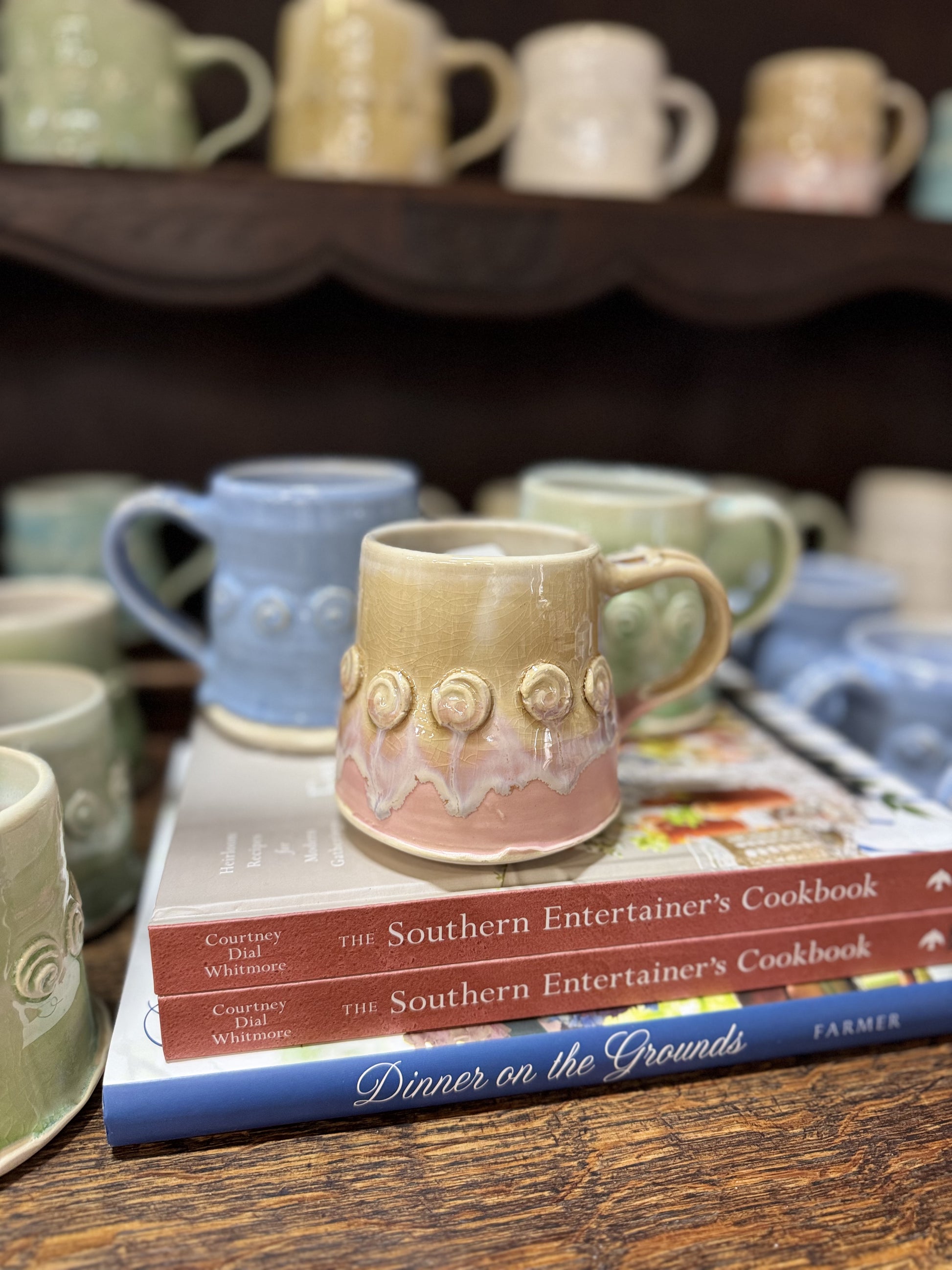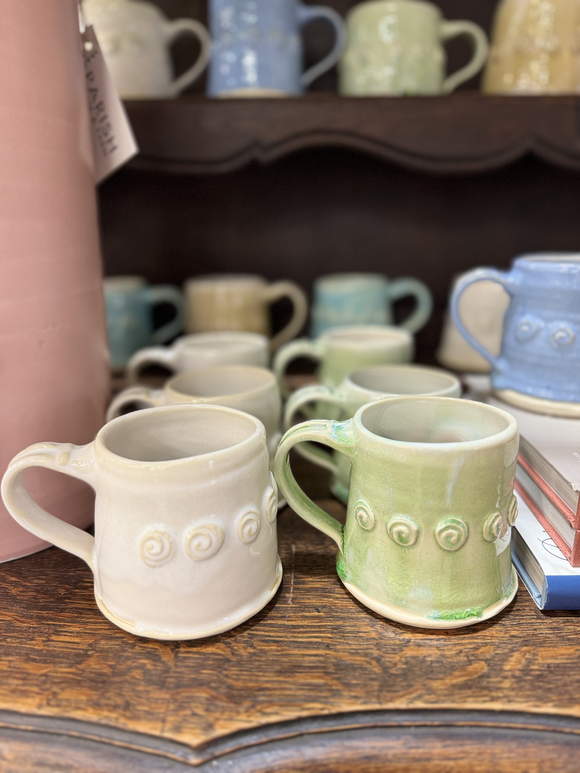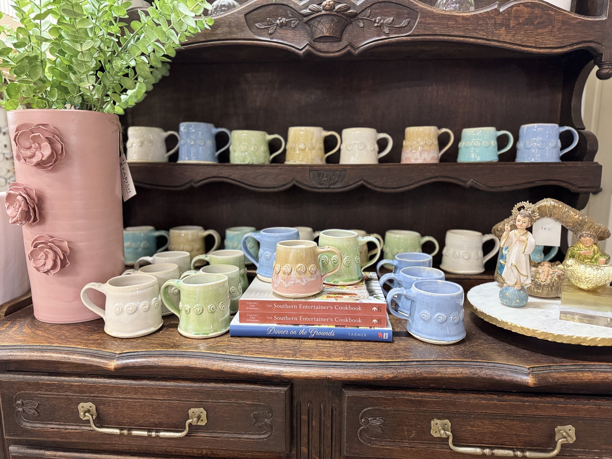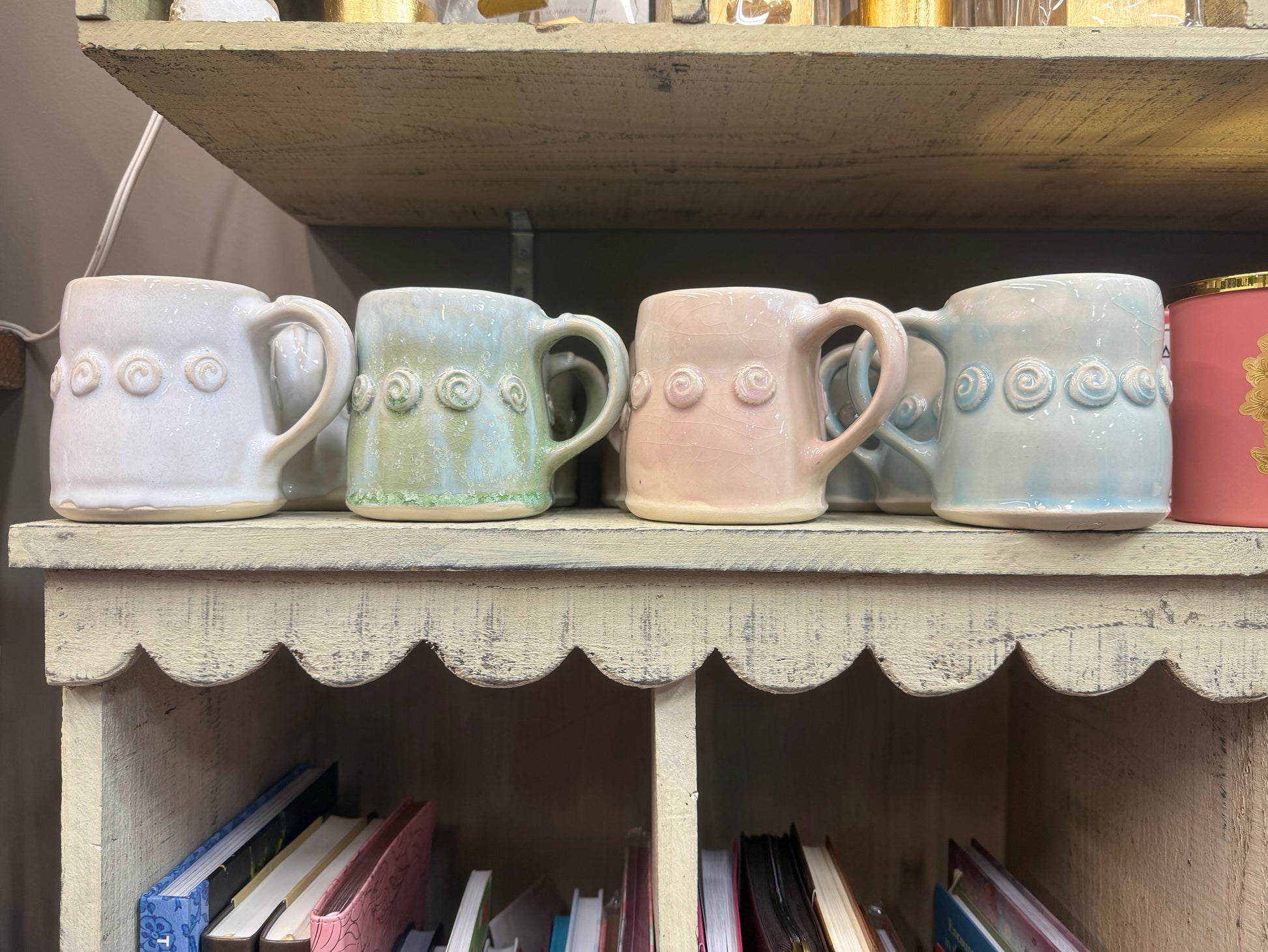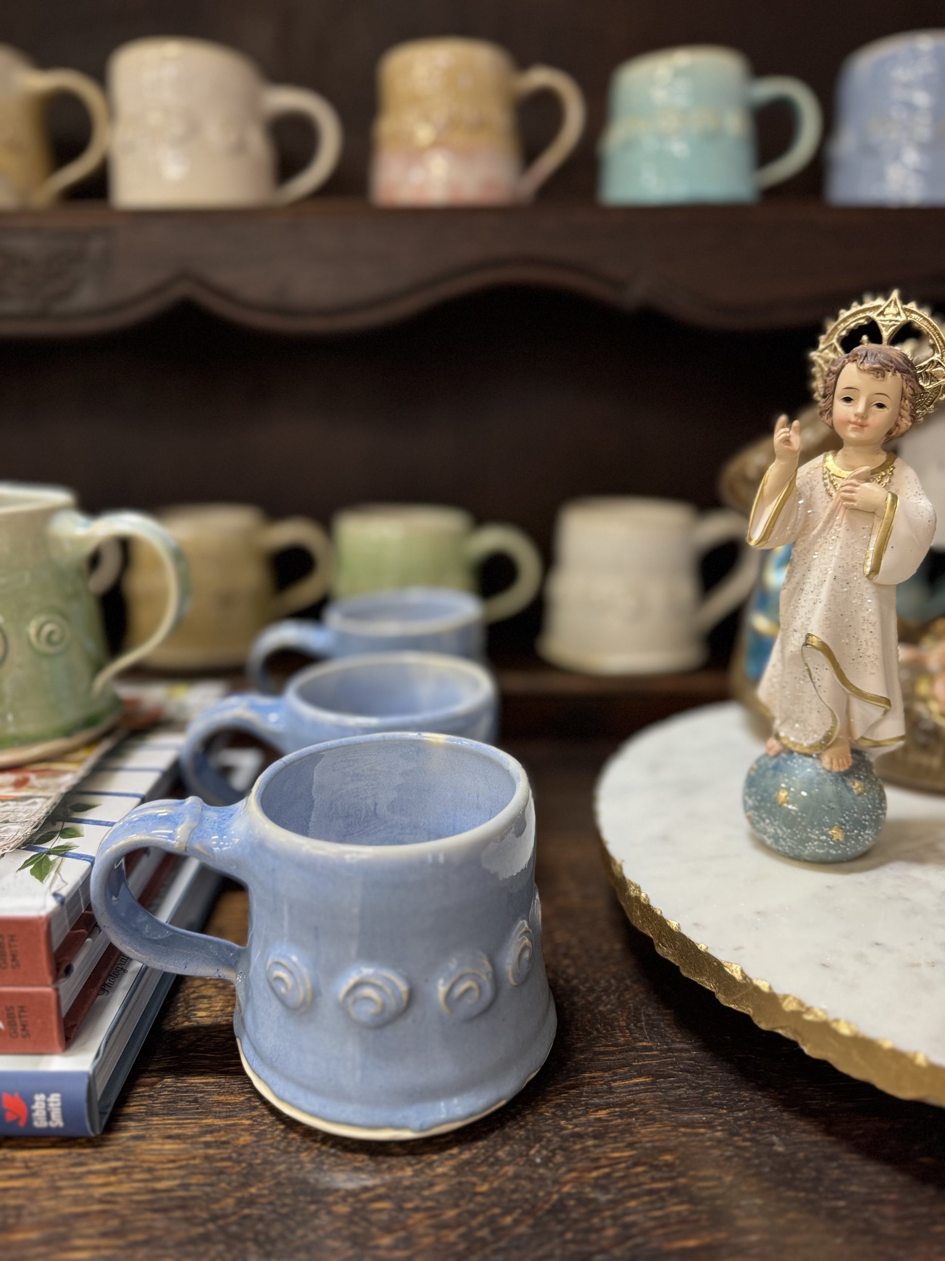 These are handmade in Bay St. Louis, MS by an amazing artist. Each mug features 10 rosettes that are hand placed on the mug. It also features a cross on the handle for the Lord's Prayer. Such a beautiful way to enjoy your favorite morning drink!