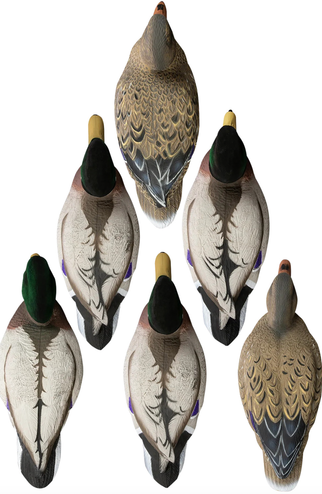 The Battleship Mallards are the official decoys of Ducks Unlimited. Add maximum impact to your spread with realism, dependability and extreme visibility from longer distances, with realistic details for finishing birds up close. Battleships are unsinkable, so you never have to worry about shooting your decoys. Swivel Heads for multiple poses. Weighted keel for quick and easy set-up. Keel allows short stringing decoys for shallow water. Higdon's detailed, painting process and deep realistic carving techniques highlight each individual feather and minimize unnatural glare, even when decoys are wet. Paint won't peel or fade. Variety pack includes 6 oversized decoys- 2 Upright Head Drakes, 1 Low Head Drake, 1 Feeder Drake, 1 Low Head Hen and 1 Feeder Hen. These Mallards have flocked heads.Dimensions- Drake High: 20.75" Beak to Tail, 8.375" Wide; 40.55 oz; Drake Low: 20" Beak to Tail, 8.25" Wide; 41.125 oz; Drake Skimmer: 20.75" Beak to Tail, 8" Wide; 33.230 oz; Hen Upright: 19.75" Beak to Tail, 8.125" Wide; 40.425 oz; Hen Skimmer: 20.125" Beak to Tail, 7.25" Wide; 28.395 oz.