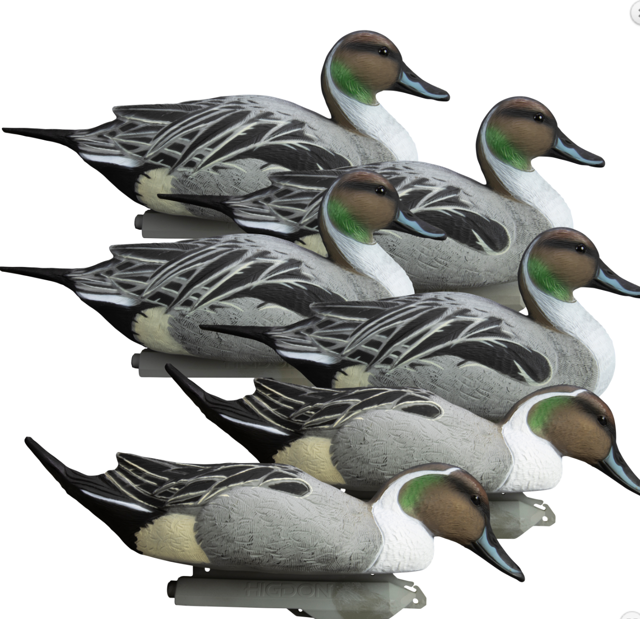 Add this big, bright, natural looking Battleship All-Drake Pintail Decoys to light up your decoy spread. The Battleship is our biggest, brightest, most durable oversize decoy, perfect for hunters who want to make a huge impact in their spread and demand a lifetime of worry-free use. Higdon set the standard for foam filling and these Battleships are unsinkable, so you never have to worry about shooting your decoys. Weighted, self-righting keel for quick and easy set-up. Keel allows short stringing decoys for shallow water. Our paint won't peel or fade, so your decoys will look great season after season, whether you leave your decoys out all season or pick up after every hunt. Package includes 6 duck decoys: 4 upright Head Drakes and 2 feeder Drakes. Dimensions and weights may vary.