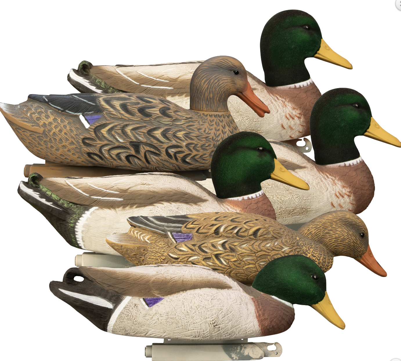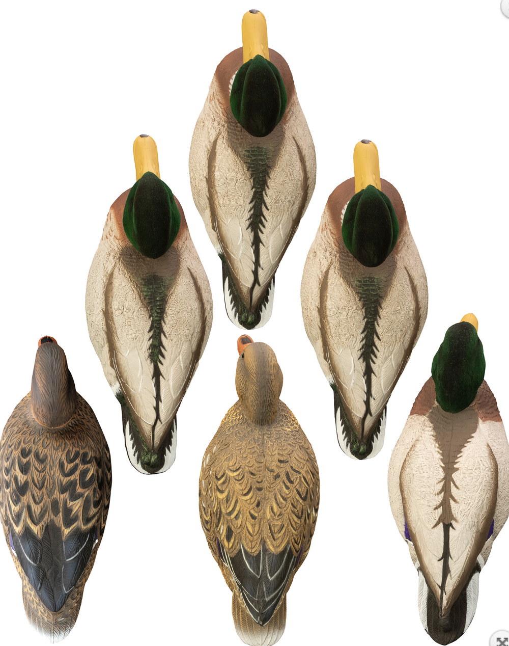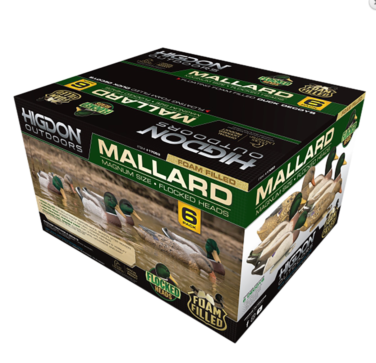 Higdon Foam Filled Magnum Mallards will last you season after season. Whether you leave decoys out all season or pick up after every hunt, these bulletproof floating decoys will look great for years. Five different postures and head positions brings a lifelike diversity to your spread. Weighted keel for quick and easy set-up. Keel allows short stringing decoys for shallow water. Higdon's detailed, proprietary UV painting process and realistic carving techniques highlight each individual feather and minimize unnatural glare, even when decoys are wet. Our paint won't peel or fade, so your decoys will look great season after season. The soft, deep green Flocked Heads on the Drakes add even more realism. Upright and Low head decoys have removable swivel heads. Package contains- 2 Upright Drakes, 1 Low Head Drake, 1 Drake Feeder, 1 Upright Hen and 1 Hen Feeder.