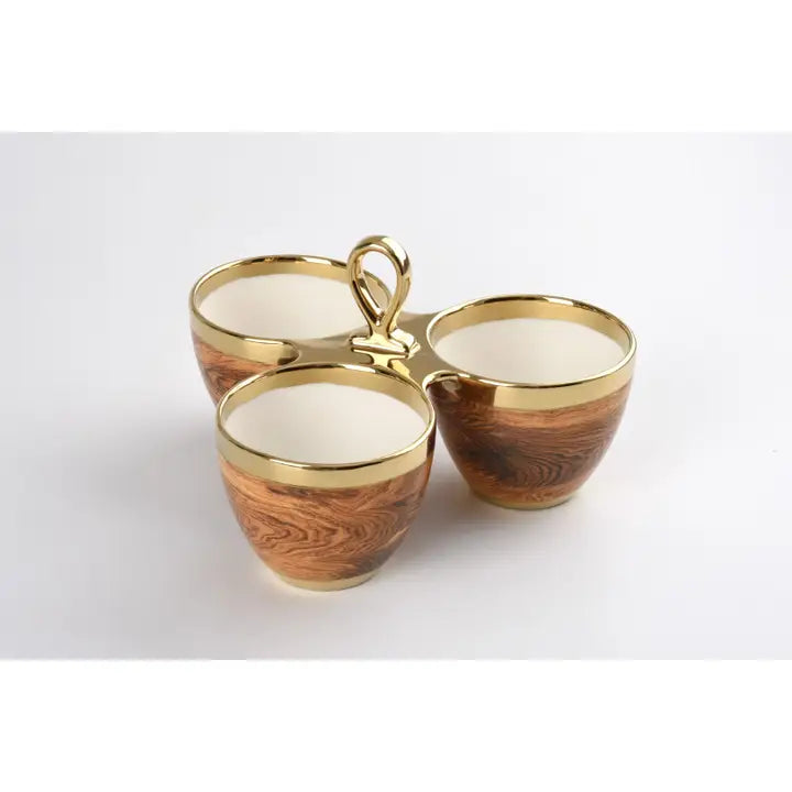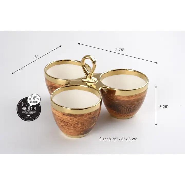 3 Part Server from our Madera Collection. Perfect for your favorite combos of dips, sauces, chip, or fruit and vegetables. Stunning high-fired porcelain with a rustic wood design and gold-toned rim. Food safe, Dishwasher safe, Oven safe. Tarnish and stain-free. Easy care.