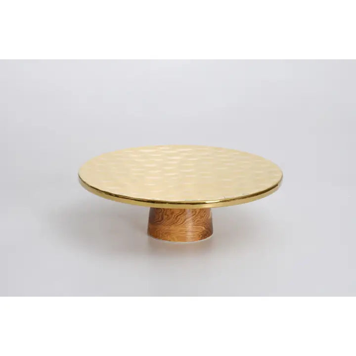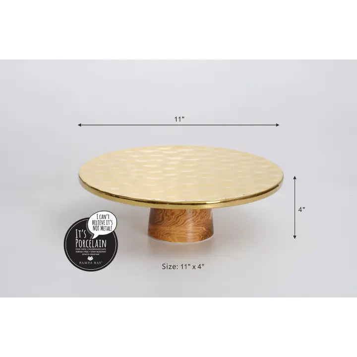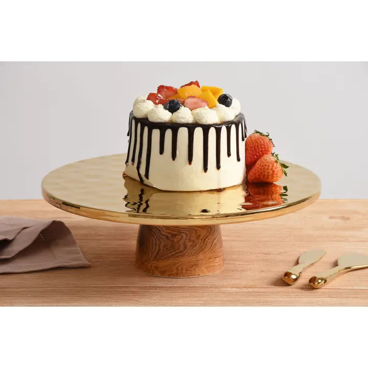 Cake Stand from our Madera Collection. An elegant way to present cakes, cupcakes, and other pastries. Elevate your desserts to a new level! Stunning high-fired porcelain with a rustic wood design and gold-toned rim. Food safe. Dishwasher safe. Oven safe. Easy Care.