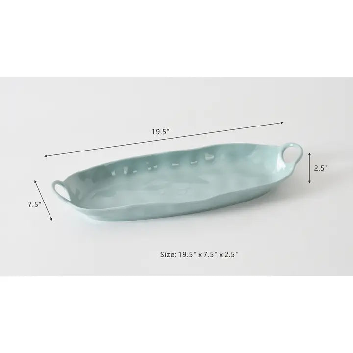 Deep Long Server from our Aqua collection. This platter is great for serving an assortment of freshly sliced breads or a variety of appetizers from stuffed mushrooms to baby lamb chops to yakitori. Asparagus, carrots, green beans, even a whole fish are all stunning on this piece. Sleek, blue-toned superior quality melamine. Great for your indoor and outdoor activities. Food safe, freezer safe, dishwasher safe. Easy care.
