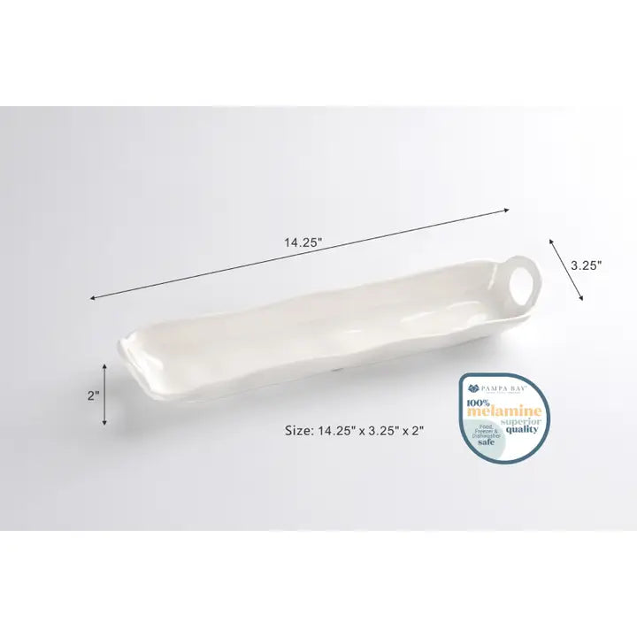 Cracker Tray from our Ivy Collection. Perfect for crackers, small cookies and other small treats. Sleek, white-toned superior quality melamine. Great for your indoor and outdoor activities Food safe, freezer safe, dishwasher safe. Easy Care.