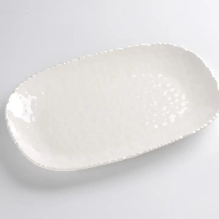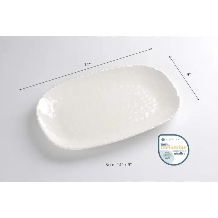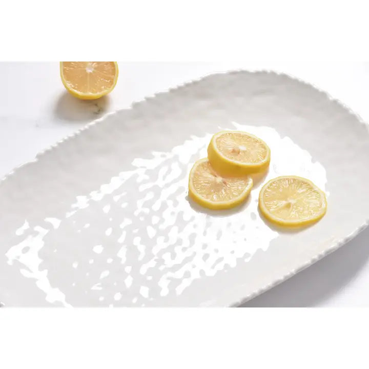Medium Serving Platter from our Wave Collection. The hammered texture and organic edges of this beautiful platter enable it to blend in with a variety of table setting motifs. Perfect for entrees, large side dishes or assorted pastries. Sleek, white-toned superior quality melamine. Great for your indoor and outdoor activities. Food safe, freezer safe, dishwasher safe. Easy Care.