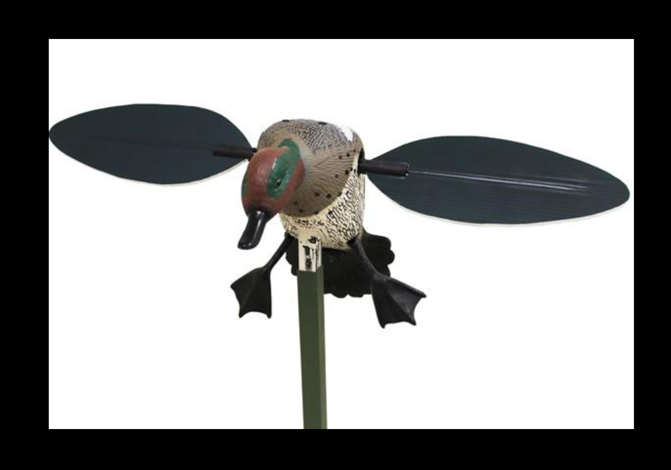 The MOJO® Teal spinning wing decoy is a realistic-looking greenwing drake with wings that turn up to twice as fast as the typical spinning wing decoy on the market today. Don’t be confused by the Mojo Teal duck decoy – this is a mallard-killing machine! It’s only a teal because its easier to turn a small wing at these speeds – and a small wing fits a teal better.