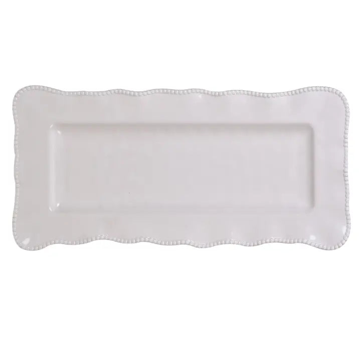 From the renowned "Perlette" collection this rectangular platter with its scalloped edge adds a touch of elegance and differentiates it from plain rectangular platters. The scalloped edges give the platter a more decorative appearance, making it suitable for both casual and formal dining settings.