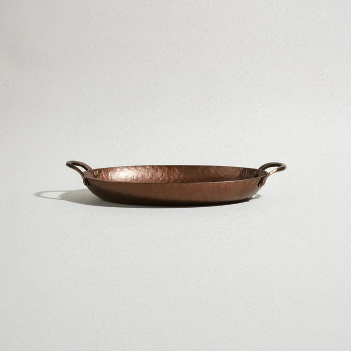 Hand-forged and limited in nature, each oval roaster is visually unique while sharing fundamental design elements, including hand hammered handles with a texture designed for easy gripping and a beautiful pre-seasoned interior finish. With performance that rivals cast iron at a lighter weight, these roasters are both functional and beautiful workhorses for your kitchen. Perfect for roast chicken and vegetables, grilled fish, baked gratins, and much more.