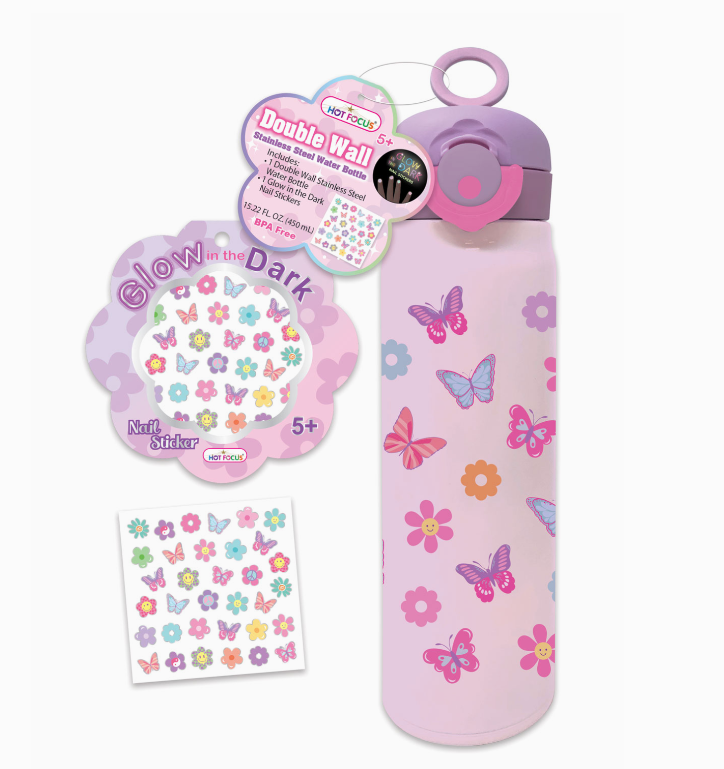 Enjoy your drink with our adorable double thermos water bottle, complete with a set of glow in the dark nail stickers.