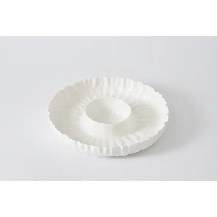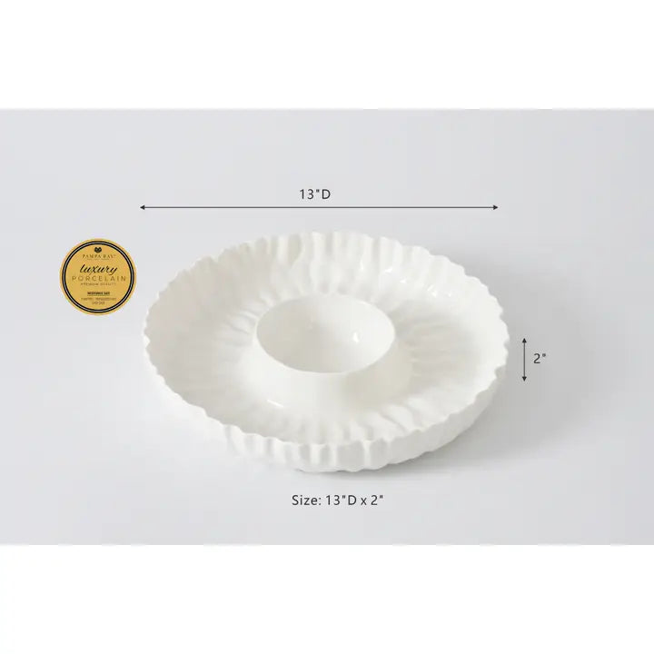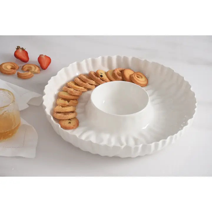 Chip & Dip from our Mascali Bianca Collection. Perfect for any dip combo: hummus and pita, salsa and tortilla chips, veggies and ranch or our favorite berries and whipped cream! Versatile high-fired porcelain pieces that are microwave safe! Food safe, tarnish free, dishwasher safe, oven safe to 500°. Easy Care.